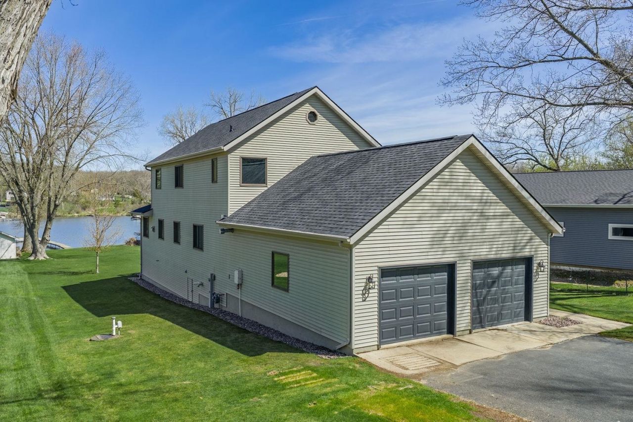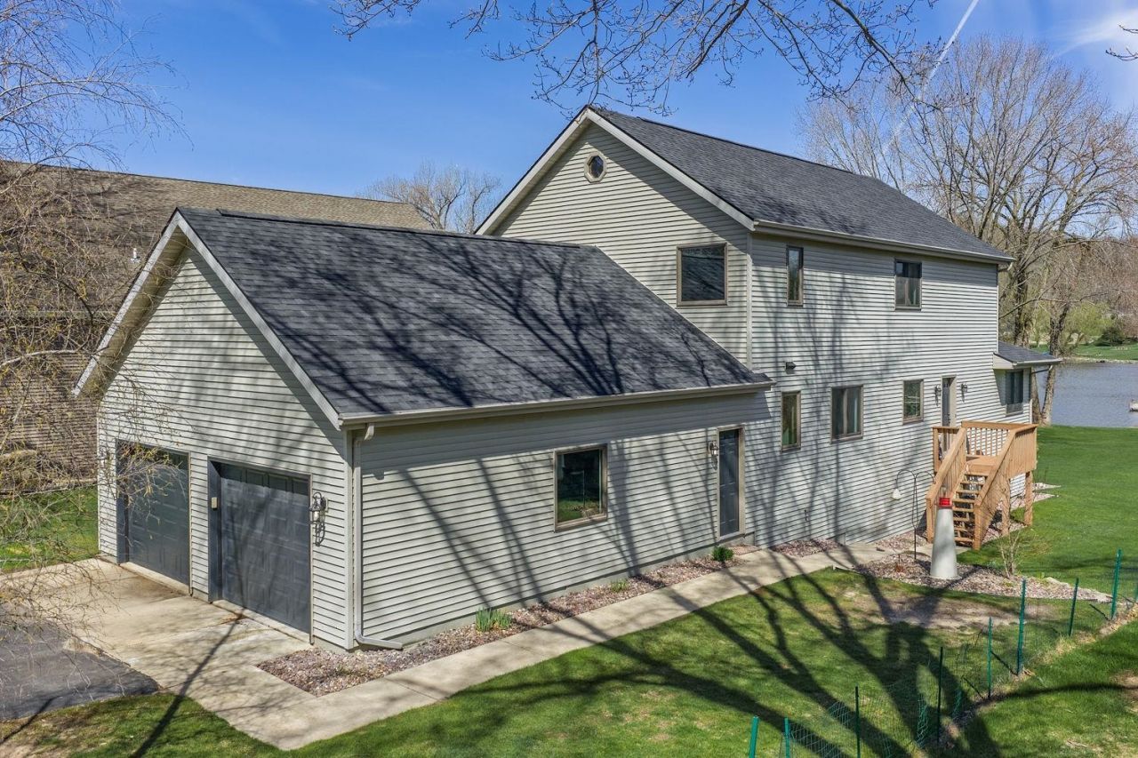 This beautifully renovated lakefront home offers 54' of frontage on a level 0.42-acre lot with 4 beds, 3 baths, positioned for stunning sunset views off the deck and easy access to lake life. The bright, open-concept layout features all new flooring, fresh paint, updated lighting, new base, doors, and a fully remodeled kitchen with new cabinetry, Quartz countertops, and new S/S appliances. A striking natural stone fireplace creates a warm focal point for gathering. The sun-filled 4-season room with skylights opens to a rear deck with Trex decking and natural gas hookup, for relaxing or entertaining. Upstairs, a redesigned retreat offers a spacious primary suite and guest bedroom, each with private bath, walk-in tile showers and lighted heat and fog-controlled mirrors. Additional highlights include a new roof and over sized heated 2-car garage. located just minutes from lakefront dining, parks, Merrimac Ferry, Ice Age Trail, public beach, and downtown.